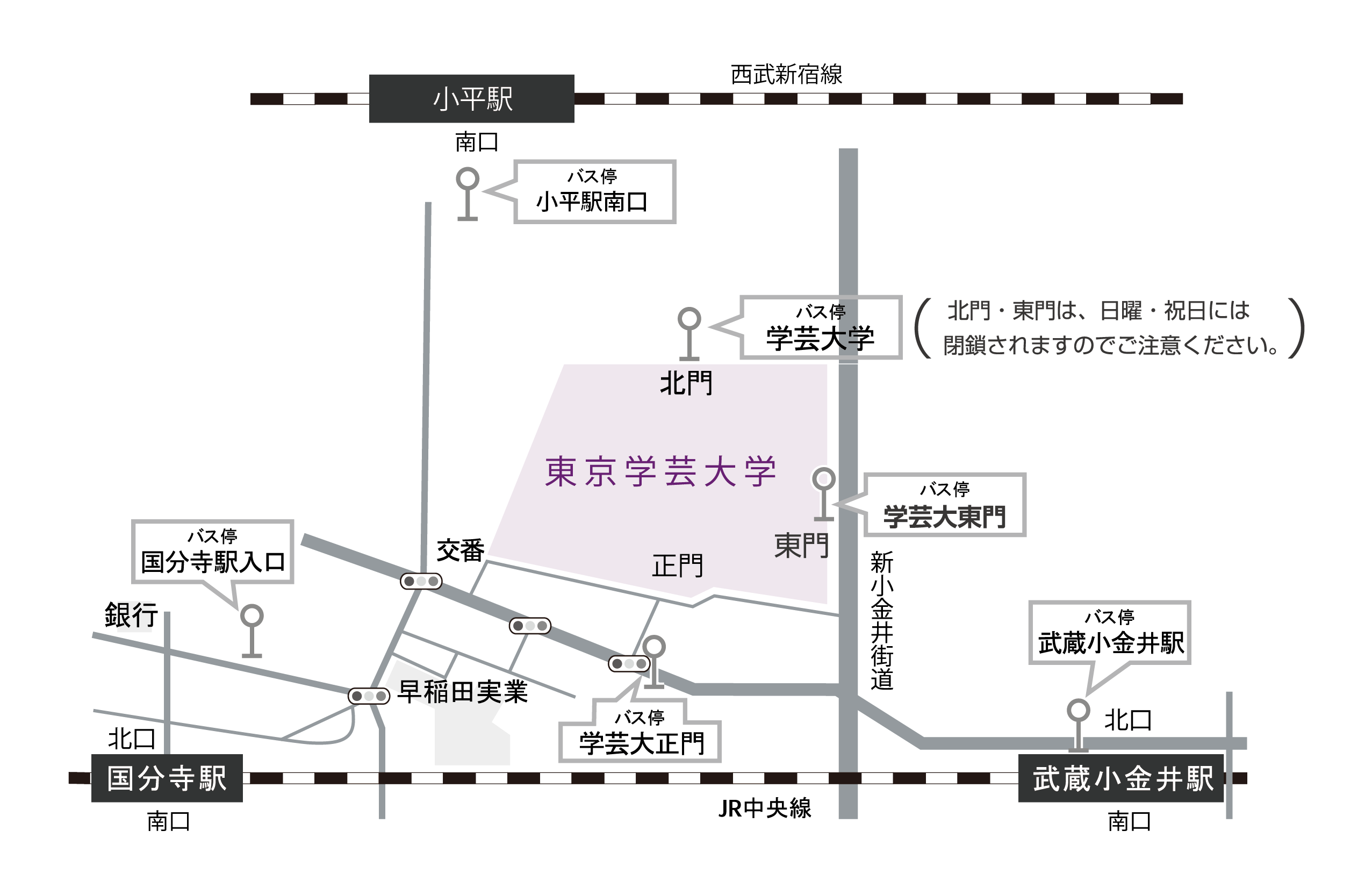【銀河鉄道バス】「国分寺駅入口」より「小平駅南口」行に乗車、約10分「学芸大学」下車